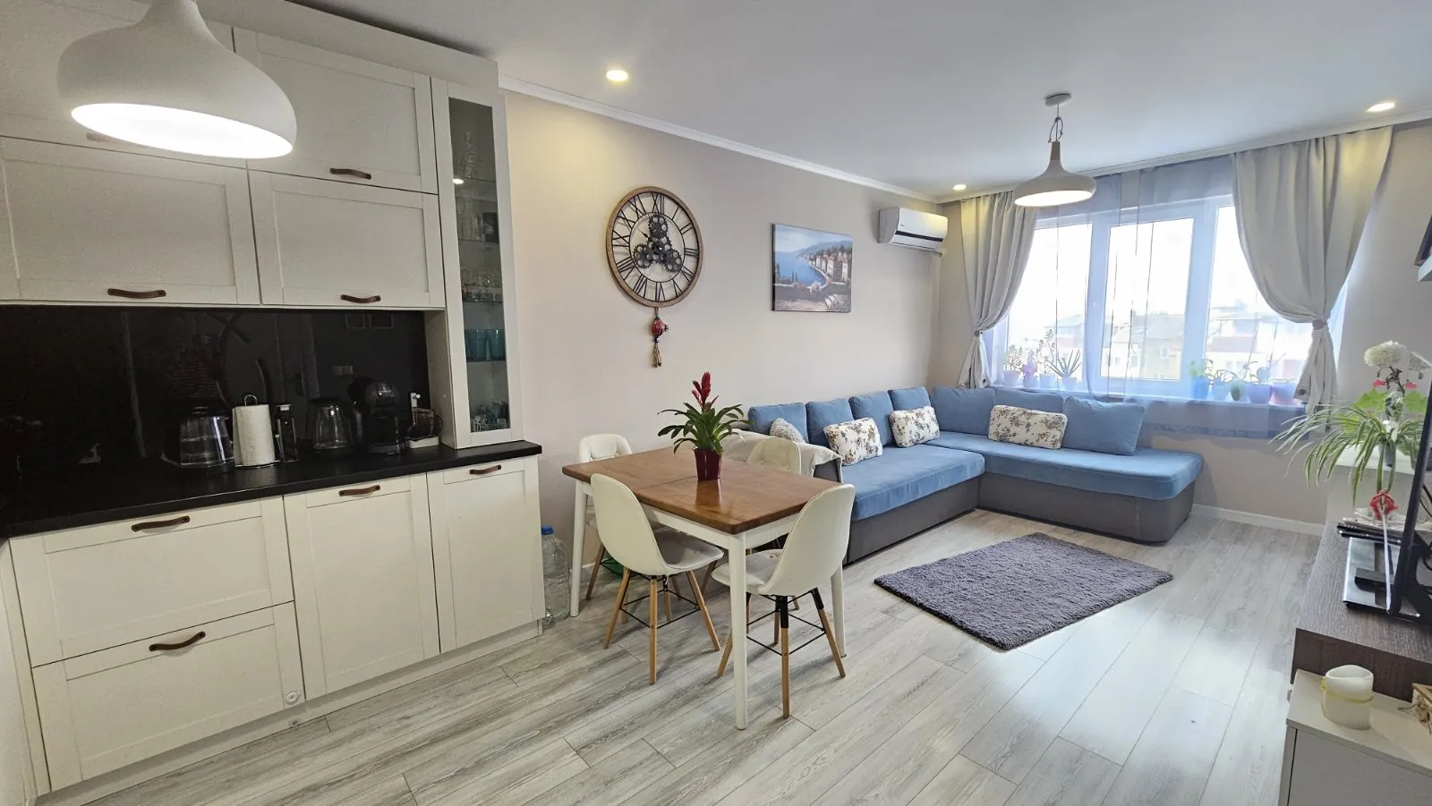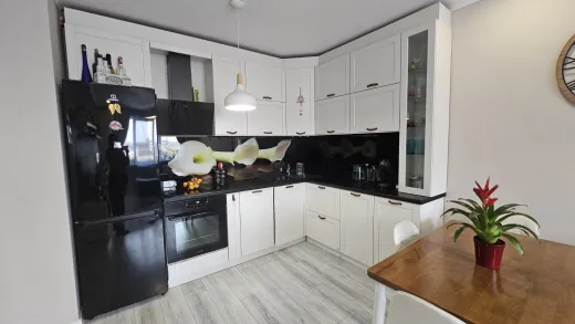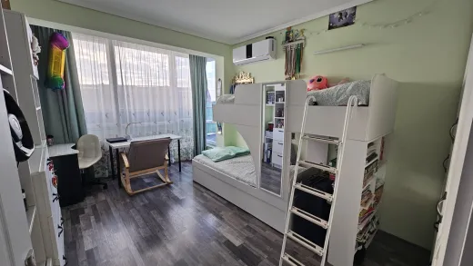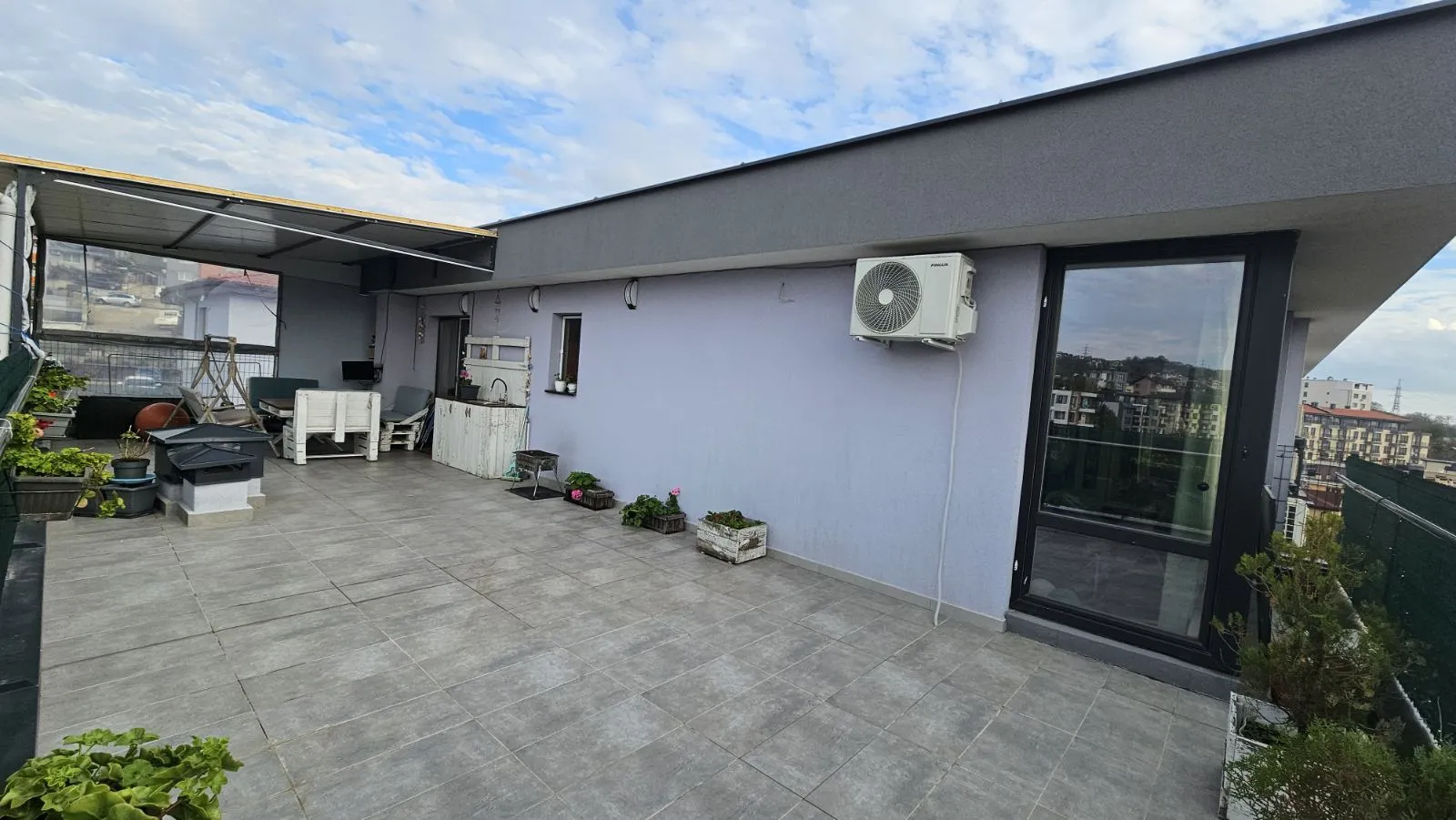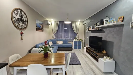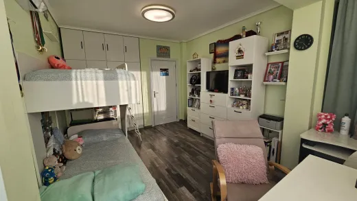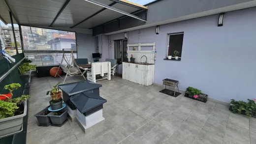 Тристаен тухлен апартамент с площ 84кв.м. и прилежаща покривна тераса 62кв.м. Малка кокетна кооперация, актувана 2019г., на 6 етажа, 25 апартамента, с ограничен достъп, двор и паркинг. Намира се в кв.Възраждане 3, на ул.Поп Димтър. Апартамента е в отлично състояние, обзаведен и оборудван с всичко необходимо за едно домакинство. Разпределение: Дневна с кухненски кът 22 кв.м., в който има всички необходими електроуреди; Родителска спалня с вграден гардероб, изключително уютна и комфортна; Детска спалня с вграден гардероб и двуетажно легло, което има и трето изтеглящо се легло ; Комбиниран санитарен възел, в който има пералня със сушилня 2в1; Антре с голям вграден гардероб с плъзгащи врати, и огромна 62кв.м. тераса с невероятна гледка към града, с излаз от двете спални. На терасата има изведена вода, направен е барбекю кът за кафе, хранене и почивка, навън лятото има надуваем басейн, шезлонги и е едно прекрасно място за релакс и почивка. Изложението на апартамента е Юг-Запад. Има климатици във всяка стая, стъклена вата за изолация на тавана, прилежащо избено помещение на партерно ниво, отлични общи части. Към имота има и паркомясто, на стойност 18000Евро. Наоколо има магазини, детски площадки, Клиника Нова, детски градини, училища, автобусни спирки на няколко автобуса от Градския транспорт. Изключително удобно и комуникативно място за семейно жилище или отдаване под наем.
